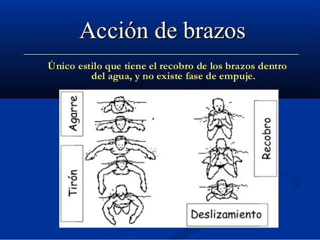 Tal y como se puede ver en el vídeo (desde el min 0:40 al 1:00), la acción de brazos en este estilo,comparada con la de otros estilos, se podría decir que es más bien una media brazada, ya que las manos permanecen frente a la línea de los hombros todo el tiempo y no sobrepasan la altura del pecho.