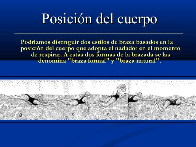 - Braza natural. Como vemos, también la podemos observar claramente en esta imagen . Sus características más destacadas son las siguientes: 1. Los hombros se elevan mucho fuera del agua y las caderas bajan sustancialmente. 2.Tracción de brazos más amplia. 3.Apenas se flexiona la cintura cuando los pies recobran para realizar la patada. 4.Patada más ancha, y mayor distancia entre las rodillas. 5.Se respira cuando los hombros están fuera del agua y la barbilla aprox. a 10cm. sobre la superficie. 6.Hay una ondulación de las caderas debida a la elevación de los hombros y posterior caída cuando el cuerpo se lanza hacia adelante.